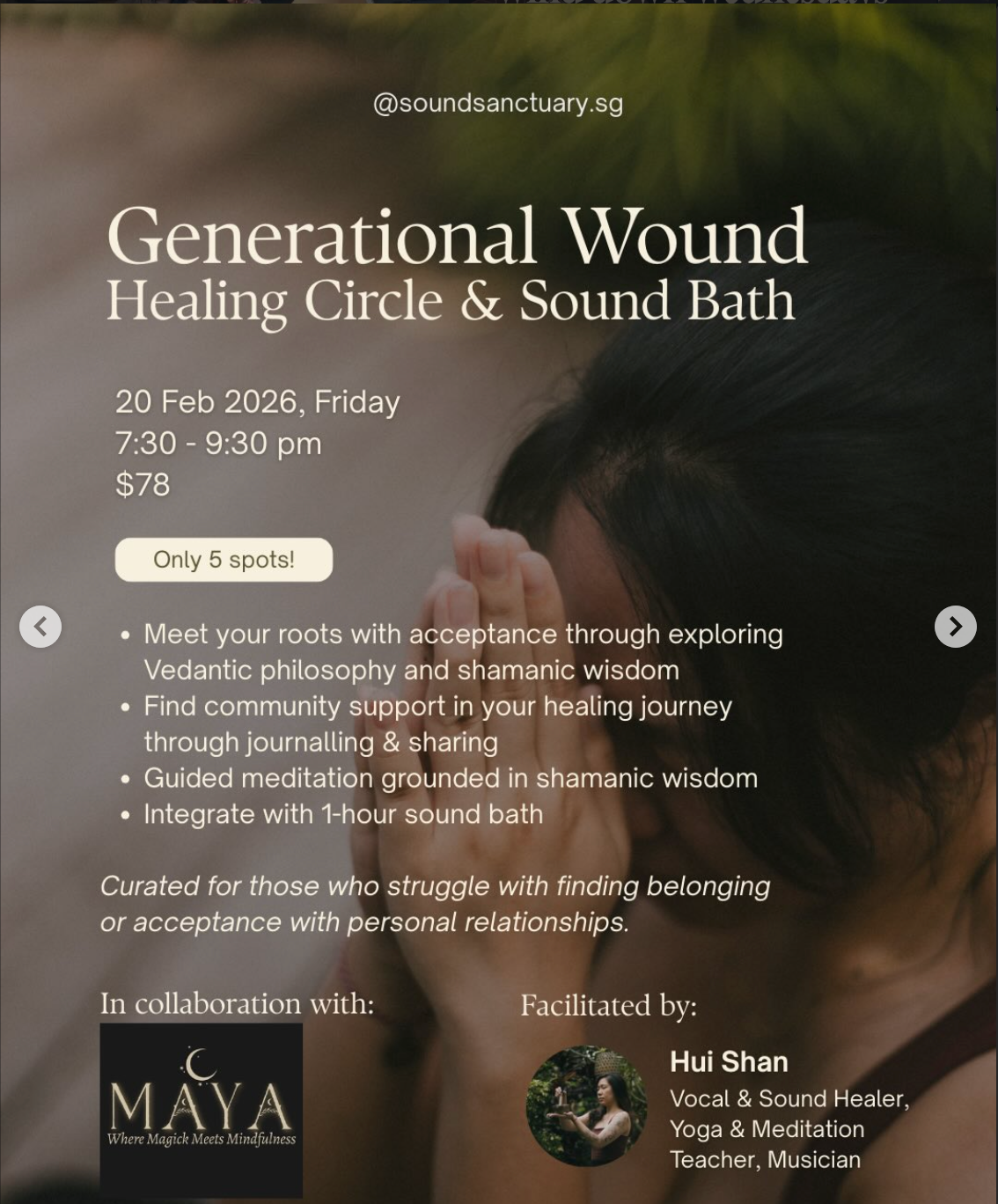 Meet your roots with acceptance through exploring Vedantic philosophy and shamanic wisdom. Find community support in your healing journey through journaling and sharing. Guided meditation grounded in shamanic wisdom and integrate with 1-hour sound bath
